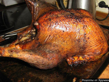 Кладем гуся на противень или решетку грудкой вниз и жарим 30 минут при температуре 200 градусов. Затем уменьшаем температуру до 160 градусов и забываем на 1,5-2 часа, в зависимости от веса. По прошествии половины времени тушку переворачиваем и периодически поливаем натопившимся жиром. Одновременно варим бульон из потрохов.