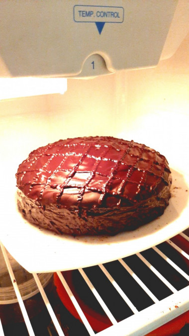 Остатки глазури (я сгребла глазурь с бумаги) переложите в мешок с узкой насадкой и нанесите решетку на поверхность торта.