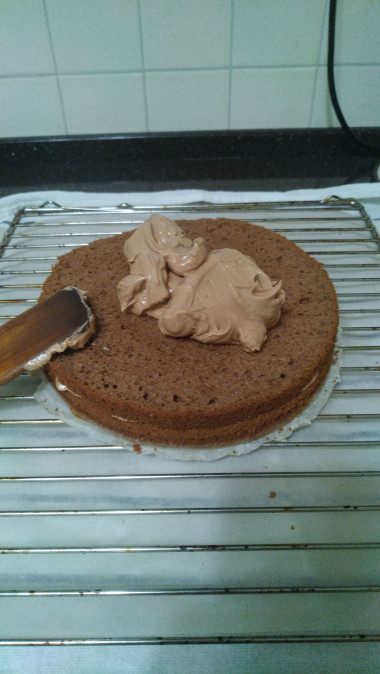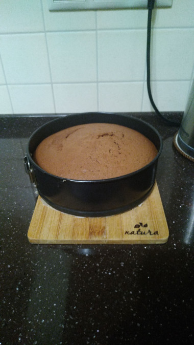 Готовый шоколадный бисквит разрежьте на три коржа.