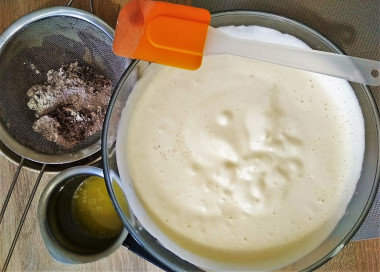 В несколько приемов добавьте просеянную смесь сухих ингредиентов. Делайте это очень аккуратно, чтобы не осадить яичную массу.