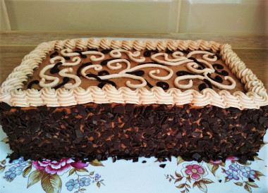 Крем сделала строго по рецепту и ничуть не пожалела - воздушный, в меру сладкий, с лёгкой горчинкой шоколада, ммм... Шоколадом готовый торт не покрывала, потому что у меня была готовая шоколадная крошка. Ею обсыпала бока, сверху сделала узоры из остатков крема. Не думаю, что это как-то повлияло на вкус торта в целом - он просто бесподобен!!! Обязательно буду делать его в дальнейшем, а также использовать по отдельности рецепт шоколадного бисквита и крема! Спасибо!