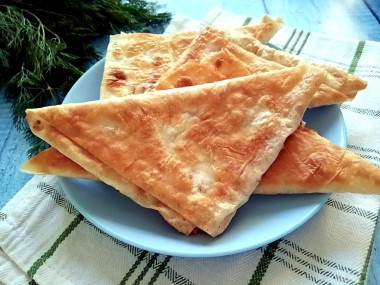 Сегодня на завтрак у нас был лаваш с сыром жареный на сковороде. Для этого накануне купила длинный ролл. Разрезала его на семь частей, одну полоску использовала для другого блюда. Поэтому у меня тоже получилось 6 треугольников. В начинку вместо моцареллы натерла на крупной тёрке вареную колбасу с жирком. Из зелени взяла только две веточки укропа, дети её не любят). При заворачивании треугольников оставалось по 1,5-2 см. лаваша, я эти кончики заворачивала вовнутрь "пирожка". Обжариваются треугольники быстро, при этом сыр успевает расплавиться. Получились они вкусными, хрустящими снаружи и сочными внутри.