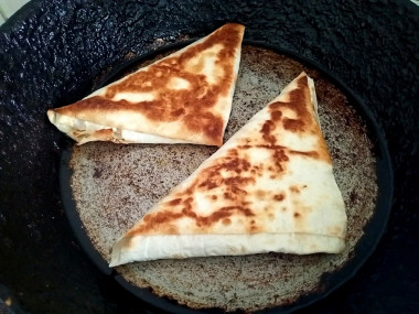 В сковороде на небольшом огне разогрейте растительное масло. Выложите треугольники из лаваша и обжарьте по 2-3 минуты с каждой стороны до появления румяной корочки.