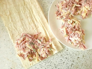 На край каждой полоски выложите по 1 ст. л. сырной начинки.