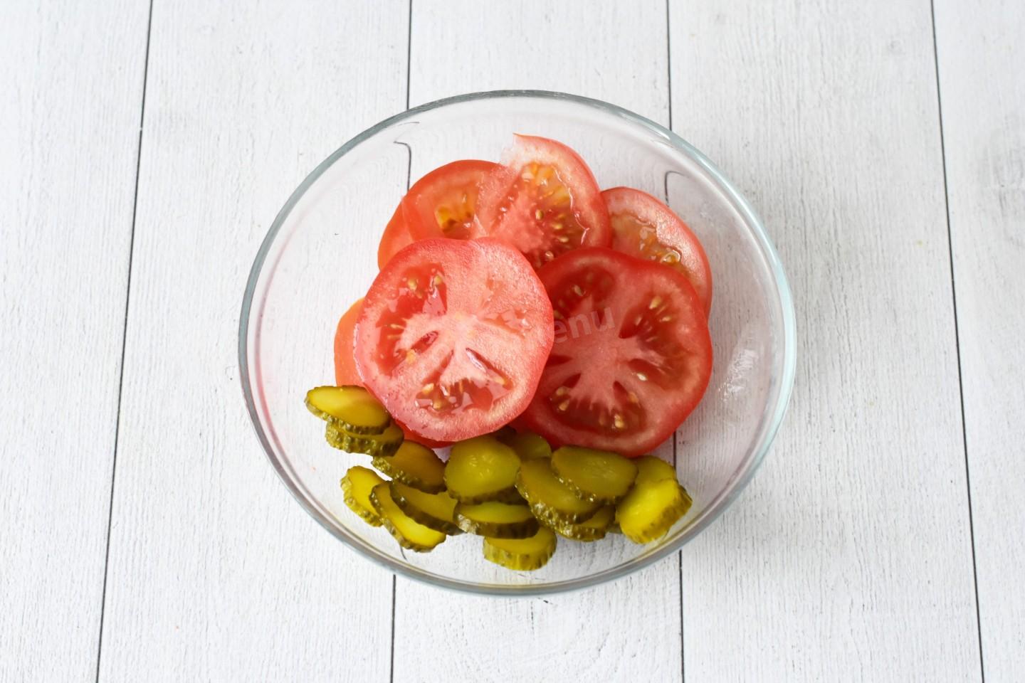Помидор вымойте и нарежьте тонкими кружочками. Помидоры выбирайте сочные, но плотные. Мягкие плоды плохо держат форму, в процессе нарезки и приготовления они расползутся в бесформенную массу и испортят внешний вид блюда. Маринованный огурец отряхните от рассола и нарежьте кружочками.