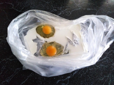 Подготовьте пакет, в котором будете готовить омлет. Подойдут обычные пакетики для завтрака небольшого размера. Для большей прочности я использовала два пакета: вложила один в другой.