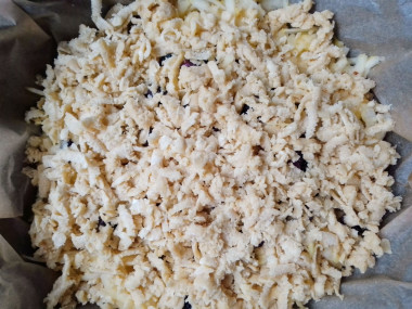 Для пирога можно использовать любую жаропрочную форму. Застелите дно и бока формы пекарской бумагой и натрите на терке замороженную большую часть теста. Немного прижмите тесто.