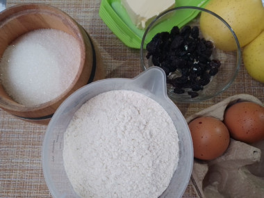 Затем разложите изюм. Посыпьте сахаром и корицей.