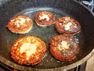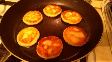 Затем творожники переверните с помощью лопатки и обжарьте их с другой стороны до золотистого цвета.