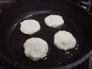 Сковороду разогрейте до горячего состояния и налейте немного растительного масла. Выложите сырники без яиц с манкой и обжарьте на небольшом огне в течение минуты.