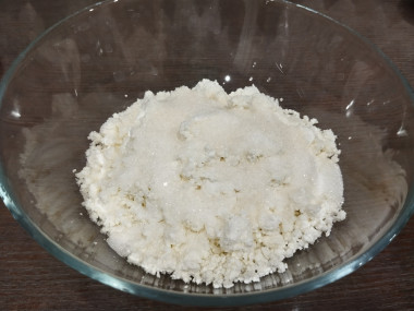 Добавьте к нему щепотку соли, ванилин и сахар. Разотрите все вместе. Ванилин добавляйте на кончике ножа, так как большее количество может придать готовому блюду горечь или замените его 1 ст.л. ванильного сахара.