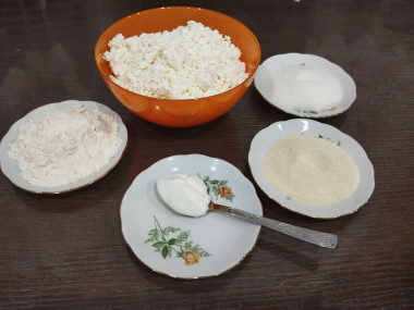 Всю массу хорошо перемешайте и оставьте постоять на 30 минут. За это время манка набухнет и тесто станет более густое и плотное. Если у вас творог изначально влажный, то можно обойтись и без сметаны. У меня творог был очень сухой и его просто необходимо было немного увлажнить. Муки может понадобиться меньше или больше, ориентируйтесь на необходимую консистенцию теста.