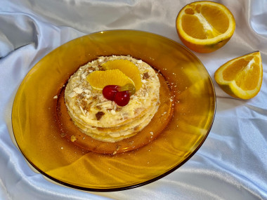 У меня не получились переложить на противень прямоугольники, они теряли форму из-за мягкости, так как использовала домашнее слоеное тесто, сделанное заранее. И я решила раскатать тесто на весь противень, а потом обрезать. Груз я не использовала, у меня один круглый, другой квадратный противни, а что-то подходящее использовать в качестве груза я так и не нашла, но и тут нашла решение, тесто конечно поднялось местами, я просто его прижала полотенцем к столу, и оно стало ровным. После я вырезала с помощью вазочки круглые коржи. Пока коржики остывали сделала заварной крем, довела до густого состояния, как советует автор в рецепте. Хорошо промазала и украсила апельсином, так как ягод не было и крошкой от коржиков.