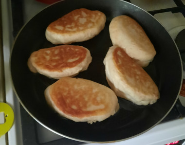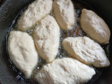 Соедините края теста и скрепите их в форме пирожка. Сразу отправьте его на сковородку жариться, выкладывая в кипящее масло швом вниз. Таким же образом лепите следующий пирожок. Делать нужно все очень быстро. Если хотите, можете заранее слепить все пирожки, а уже потом их жарить.