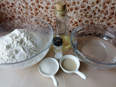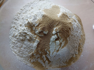 Начните с замешивания теста. Никакой опары мы ставить не будем, а сразу замесим тесто из всех ингредиентов. Сначала смешайте все "сухие" составляющие: часть муки (около 2 стаканов), сухие дрожжи, соль и сахар.