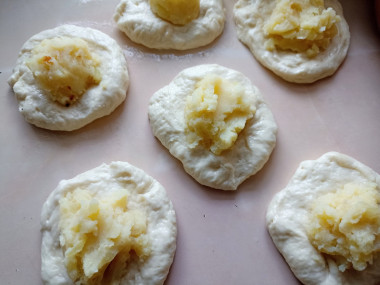 Поставьте на плиту сковороду с маслом нагреваться. И начните лепить первые пирожки. Рукой придавайте куску теста форму лепешки, не обязательно красивой и ровной, пирожки еще поднимутся, и все неровности скроются. Выкладывайте начинку, ее должно быть в два раза меньше теста. Хотя это по желанию, можете класть больше.