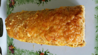 Вынуть из духовки, раскрыть фольгу и посыпать рулет тертым сыром, отправить противень в духовку еще на какое-то время. Как только рулет покроется румяной сырной корочкой, его можно извлекать из духовки и подавать к столу.