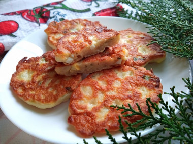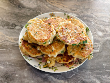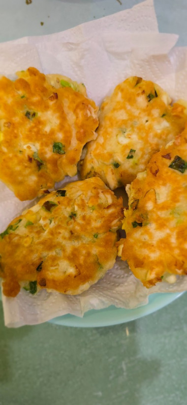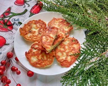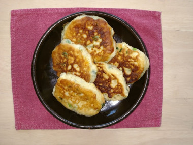 Разогрейте на сковороде небольшое количество растительного масла. Ложкой выкладывайте тесто в виде лепешек на небольшом расстоянии друг от друга, поскольку они будут увеличиваться в размере. Жарьте пирожки на небольшом огне по 3-4 минуты с каждой стороны, чтобы они успели пропечься и не были сырыми в середине. Готовые пирожки снимите и жарьте следующие партии. У меня вышло 11 пирожков. Подливайте масло по надобности между партиями.
