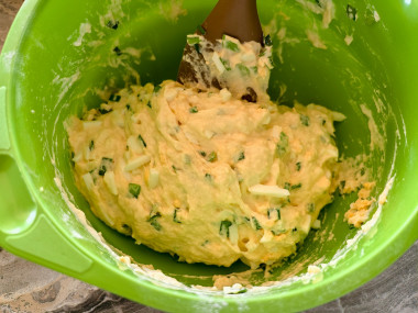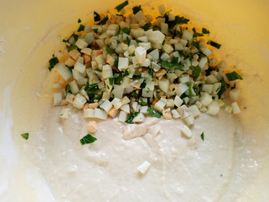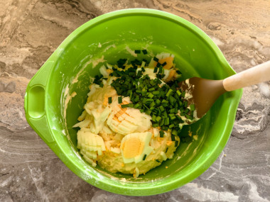 На последнем этапе добавьте в тесто вареные яйца и зеленый лук, перемешайте. Тесто для пирожков готово. Теперь приступим к жарке. Как выбрать сковороду и масло для обжаривания пирожков читайте в статьях в конце рецепта.
