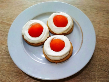 Пасхальное печенье с абрикосом выглядит настолько удивительно, что я, конечно, не смогла "пройти мимо" такого необычного печенья. Учитывая, что сезон свежих абрикос уже начался, то использовала именно их, а не консервированные. Тесто для печенья получилось очень мягкое и жирное. Перед тем, как раскатать его в пласт, я поместила его в холодильник на некоторое время. Затем стала раскатывать сразу на коврике для выпечки. Оно сильно прилипало к скалке, я накрыла его листом пергамента, и всё раскаталось отлично. Печенье получилось тонкое, хрустящее и очень вкусное само по себе. Глазурь я не стала делать, потому что у меня оставался творожный крем от торта. Я отсаживала его вокруг абрикосок с помощью кондитерского мешка. Получились не печенья, а пирожные!! Сочетание песочного теста, творожного крема и свежего сладкого абрикоса с лёгкой кислинкой просто изумительно! Конечно, если покрыть печенье глазурью (как в рецепте), то их можно транспортировать в коробке, не боясь, что испортиться внешний вид, а если использовать консервированные абрикосы, то увеличится их срок хранения. Чего не скажешь о моих пирожных - их ни транспортировать, ни долго хранить не получится. Но никого это не расстроило, всё было быстро съедено. Мне очень понравились и оформление под яичницу-глазунью, и вкус печенья с абрикосом, восхищаюсь креативностью автора этой идеи и выражаю благодарность, спасибо!