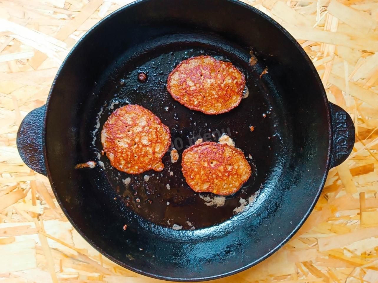 Жарила котлетки на чугунной сковороде на небольшом огне примерно по 2,5-3 минуты с каждой стороны. Получились печеночные котлеты сочные, нежные, очень вкусные. Хорошо прожаренные с одной стороны, они легко переворачиваются на другую. Подавала котлеты с гречкой.