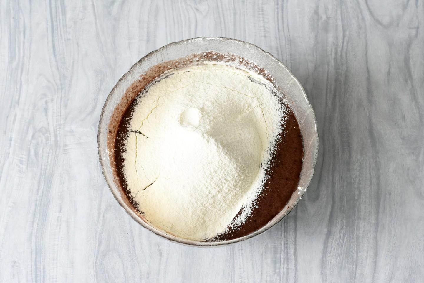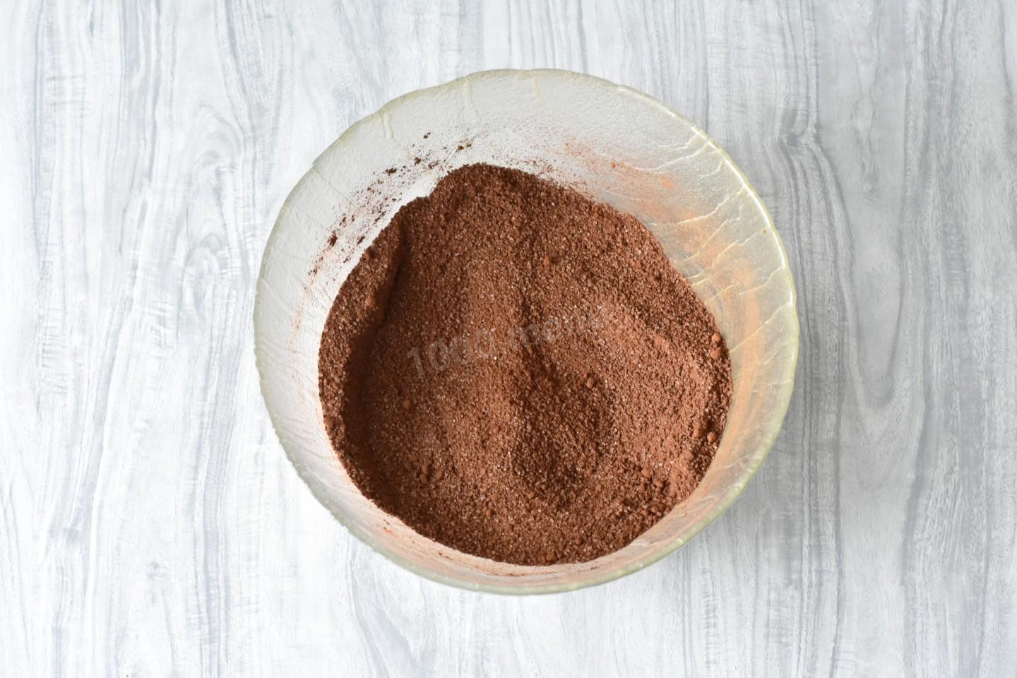 В большой миске смешайте какао и сахар. Какао берите качественное, желательно алкализованное. Алкализованное какао (обработанное щелочью) придаст выпечке глубокий шоколадный вкус и насыщенный темный оттенок, в то время как обычный какао-порошок может дать более светлый и менее выраженный цвет. Информацию о какао вы найдете в статье по ссылке под шагами.