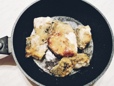 На горячую сковороду налейте немного растительного масла и выложите запанированные стейки. Обжарьте их пару минут на сильном огне, до образования румяной, хрустящей корочки.