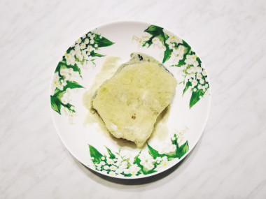 Дальше я делала всё согласно рецепту - обваляла рыбу в муке, затем в яйце, потом в панировочных сухарях. Обжарила стейк зубатки на сковороде с двух сторон по 3 минуты до появления красивой корочки, убавила нагрев и подержала на огне ещё 6 минут (перевернула рыбу один раз за это время).