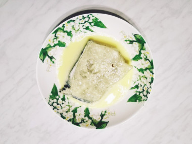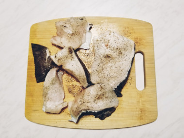 У меня был куплен замороженный стейк в виде пласта. После разморозки оказалось, что зубатка порезана разными кусками. Всё, что мне оставалось сделать - почистить кожицу рыбы ножом от налёта и промыть холодной водой.