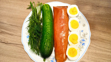 Просто, быстро,вкусно, полезно! Салат с семгой готовится быстрее, чем варятся яйца. У меня сёмги не было, взяла балык нерки. Солёная красная рыбка прекрасно сочетается со свежим огурцом и вареными яйцами. Салат простой, но, как говорят, и в пир, и в мир. Для меня он сытный, полноценный ужин, например. А можно и как закуску подать.