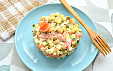 Приготовила салат Оливье с семгой по этому рецепту. Вкусно, смачно, ново! Только я решила заменить маринованный огурчик свежим и не использовала зеленый лук. Однозначно, что на «толпу» такой Оливье невыгодно готовить (я имею в виду тазик), ведь красная рыбка все же дорого стоит. На 2-4 порции вполне реально. А так рекомендую!