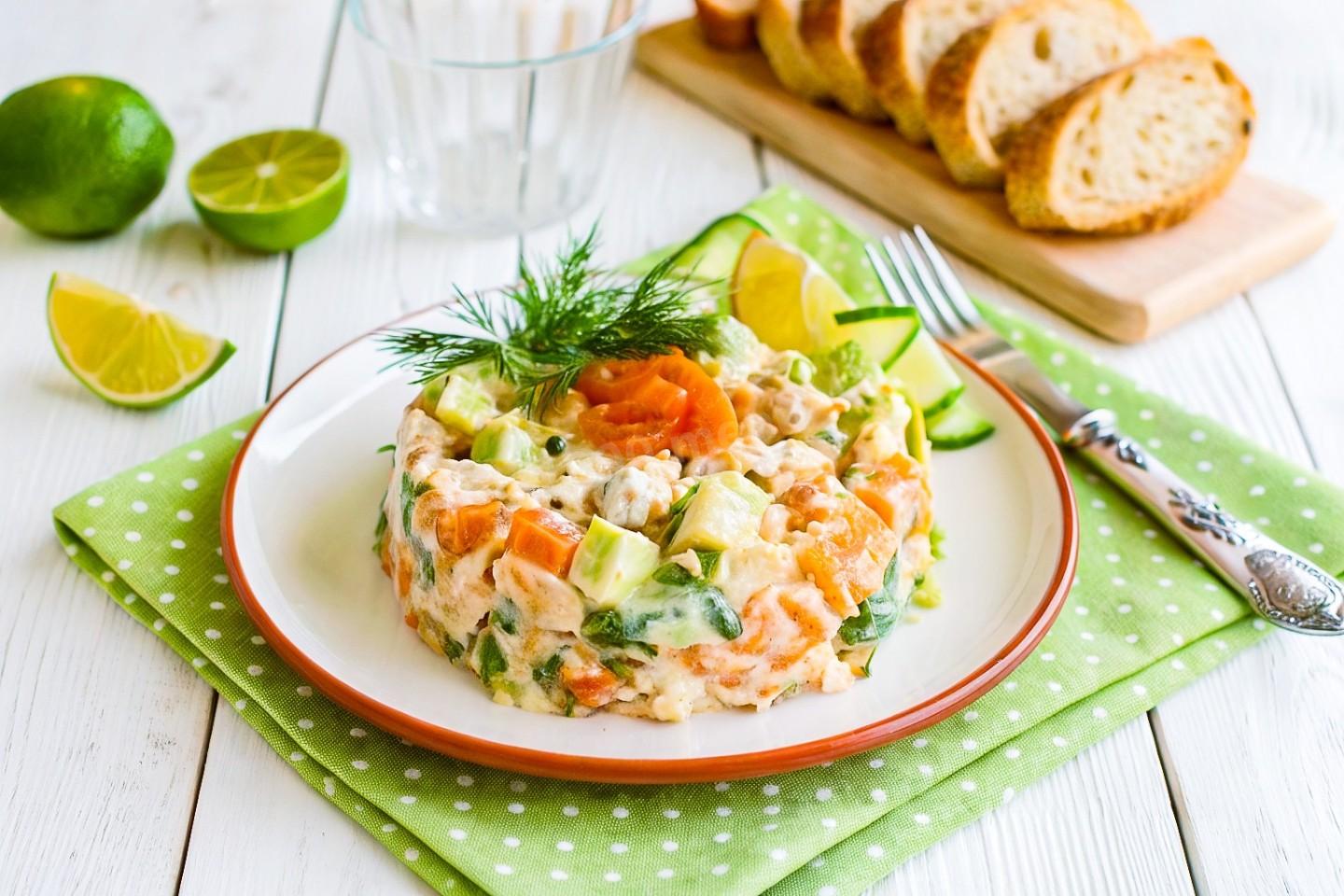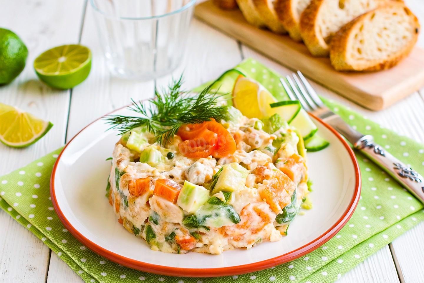 Есть облегченный рецепт салата с семгой, огурцами, яйцами и без картошки.