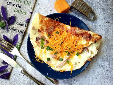 На завтрак приготовила омлет с курицей и сыром на сковороде. Вчера специально оставила кусочек отварной куриной грудки, когда делала салат. Обжарила нарезанный репчатый лук, добавила к нему нарезанную куриную грудку. Затем сверху вылила слегка взбитое с молоком яйцо. Когда омлет немного схватился, выложила на него натёртый сыр и с помощью лопатки свернула омлет пополам. Получилось очень сытно, вкусно. Отличный завтрак! Спасибо автору за рецепт!