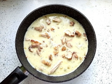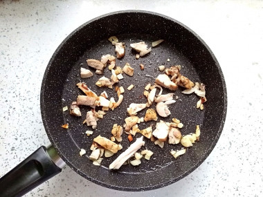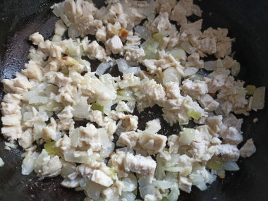 К обжаренному луку выложите кусочки отварной курицы и обжарьте всё вместе буквально 1 минуту.