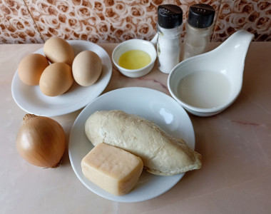 Как пожарить омлет с курицей и сыром на сковороде? Подготовьте все необходимые ингредиенты. Куриное мясо необходимо заранее отварить в подсоленной воде. Оливковое масло можно заменить обычным подсолнечным. Сыр натрите на мелкой терке. В этот раз я использовал пармезан, но можно взять любой твердый сыр.