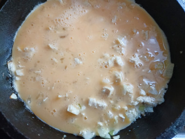 Залейте курицу с луком яичной смесью и убавьте огонь до среднего.