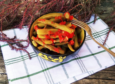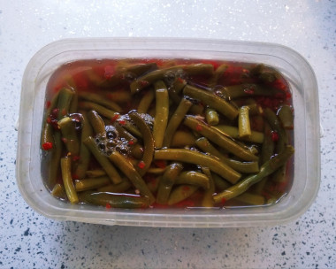 Такое блюдо я готовила впервые, вообще-то я из свежей стручковой фасоли еще мало что готовила) Даже и не знала как этот продукт поведет себя при квашении. Квасить решила не на зиму, а просто для пробы в контейнере. Фасоль отварила, остудила. Рассол тоже вскипятила и остудила. Острого перца у меня не нашлось, поэтому заменила его на порошок того же красного жгучего перца. С квашением возникли вопросы) Не понятно было как должна выглядеть эта фасоль к концу закваски. В рецепте написано, что пять дней, но у меня на кухне довольно тепло. В общем квасила стручки три дня, потом попробовала и фасоль оказалась уже кисленькой. Поэтому решила убрать в холодильник на пару дней. При дегустации мы с мужем чуть не съели половину этого контейнера) Закуска оказалась очень крутой. Для нас необычно. Вкус кисло-острый. Похоже одновременно на квашеные капусту и зеленые помидоры одновременно. Главное, это очень вкусно! Отличная осенняя закуска. Спасибо за новый для меня вкус)