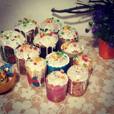Вообще с таким набором продуктов получается 4 больших кулича, или 6 средних, или 8 разных, или еще больше маленьких. На среднюю семью вполне достаточно.