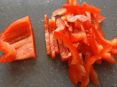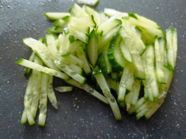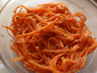 Смешайте корейскую морковь, огурец, болгарский перец, куриное мясо и рисовую лапшу. Приправьте кориандром и красным перцем. Заправьте соевым соусом и растительным маслом, все хорошенько перемешайте и дайте настояться в течении 30 минут.