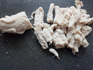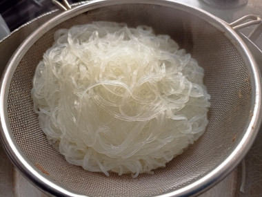 Как сделать салат из рисовой лапши с овощами и курицей? Рисовую лапшу залейте кипятком и варите не более трёх минут, затем откиньте на дуршлаг и дайте стечь воде. Куриную грудку также залейте кипятком, посолите и варите 20 минут. Переложите куриное мясо на тарелку и дайте остыть.