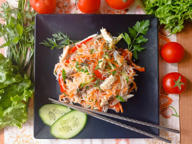Приготовила салат из рисовой лапши с овощами и курицей. Куриную грудку отварила заранее, морковь по-корейски использовала домашнюю, ее также приготовила накануне. Отваренную рисовую лапшу соединила с нарезанными соломкой овощами, корейской морковью, заправила салат растительным маслом, соевым соусом, приправами и зеленью. Вкусный салат получился, в меру острый за счёт добавления моркови по корейски, яркий, аппетитный. Спасибо автору за рецепт!
