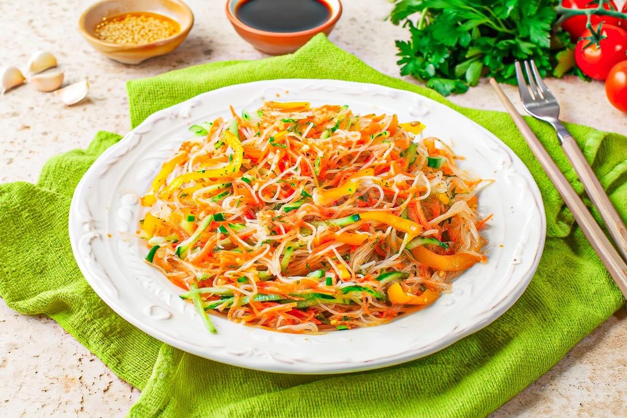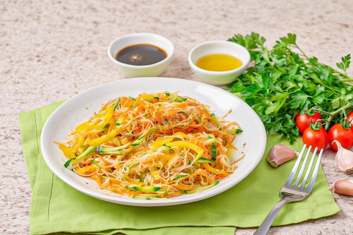 Смешайте корейскую морковь, огурец, болгарский перец, куриное мясо и рисовую лапшу. Приправьте кориандром и красным перцем. Заправьте соевым соусом и растительным маслом, все хорошенько перемешайте и дайте настояться в течении 30 минут.Шаг 6: