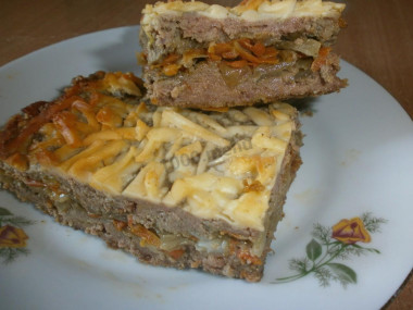 Сверху выложите зажарку из лука и моркови. Распределите ее равномерно по всей поверхности силиконовой лопаткой или ложкой.