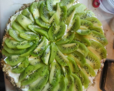Киви очищаем, нарезаем тонкими пластинками. Выкладываем пластинки киви внахлёст на верхний корж. В центр коржа можно поместить дополнительно любые ягоды, фрукты. Заливаем водой сухой порошок желе быстрого приготовления в кастрюльке, готовим желе согласно инструкции на упаковке. Заливаем верх торта получившимся прозрачным желе для тортов, ставим торт в холодильник на несколько часов. После того, как он настоится, - станет ещё вкуснее. Приятного аппетита!