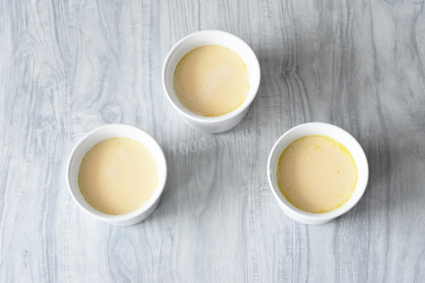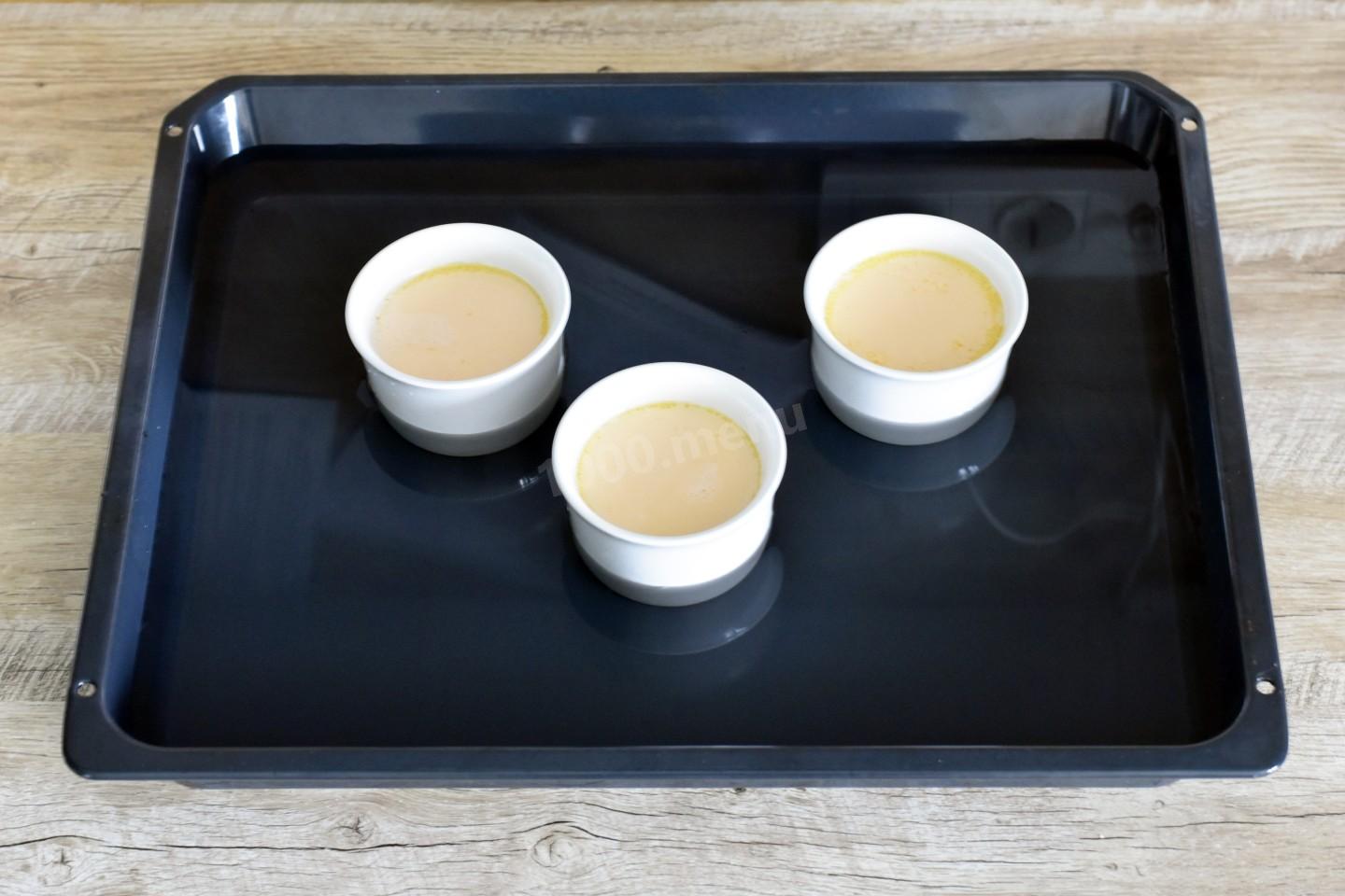 Порционные формочки смажьте сливочным маслом. Разлейте карамель по формам и оставьте до застывания. Точное количество порций зависит от размера ваших формочек. В каждую формочку поверх застывшей карамели аккуратно вылейте яично-молочную смесь. Информацию о формах для выпечки вы найдете в конце рецепта под шагами. Формочки поставьте в глубокий противень. В противень влейте столько воды, чтобы она доходила до середины формочек.