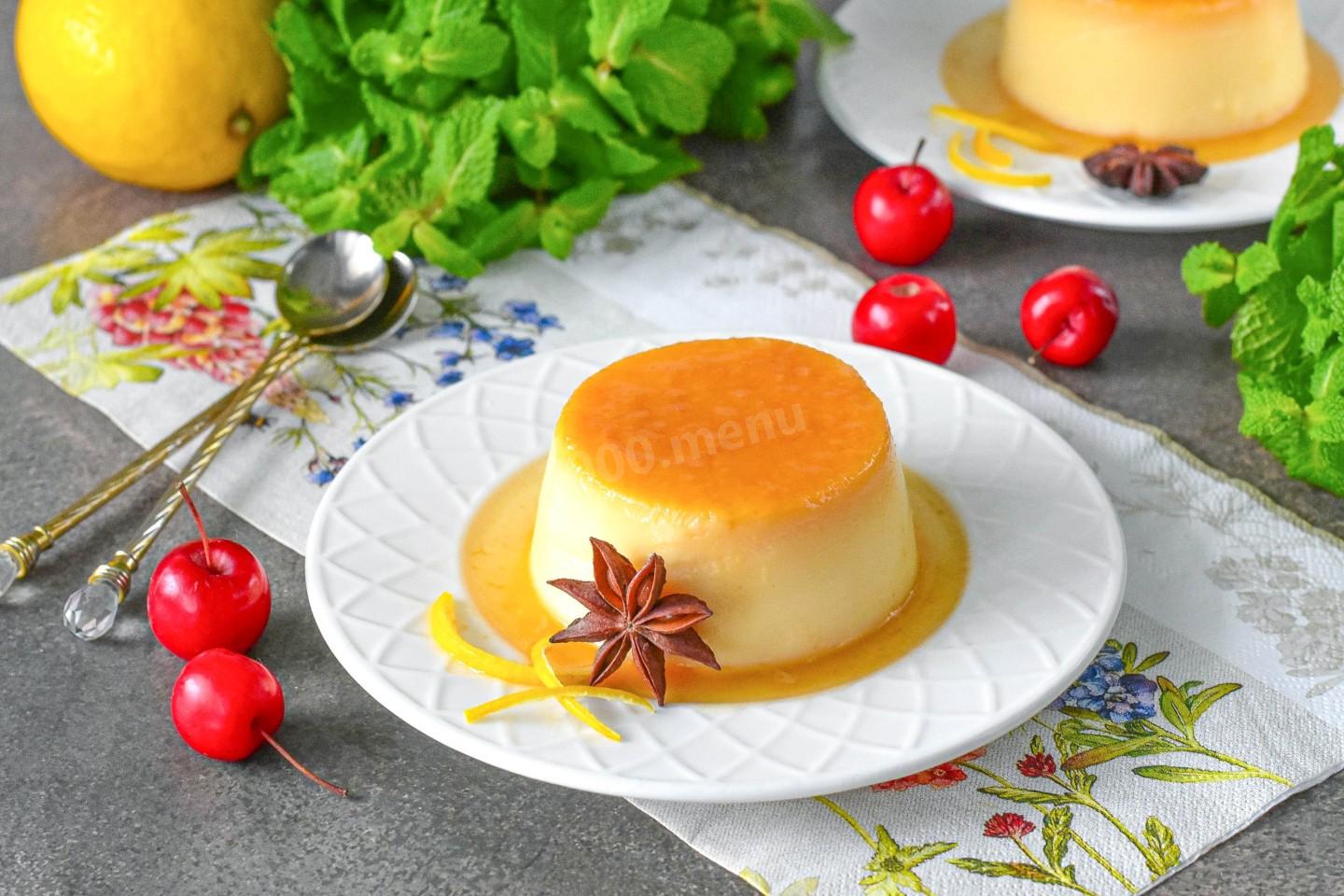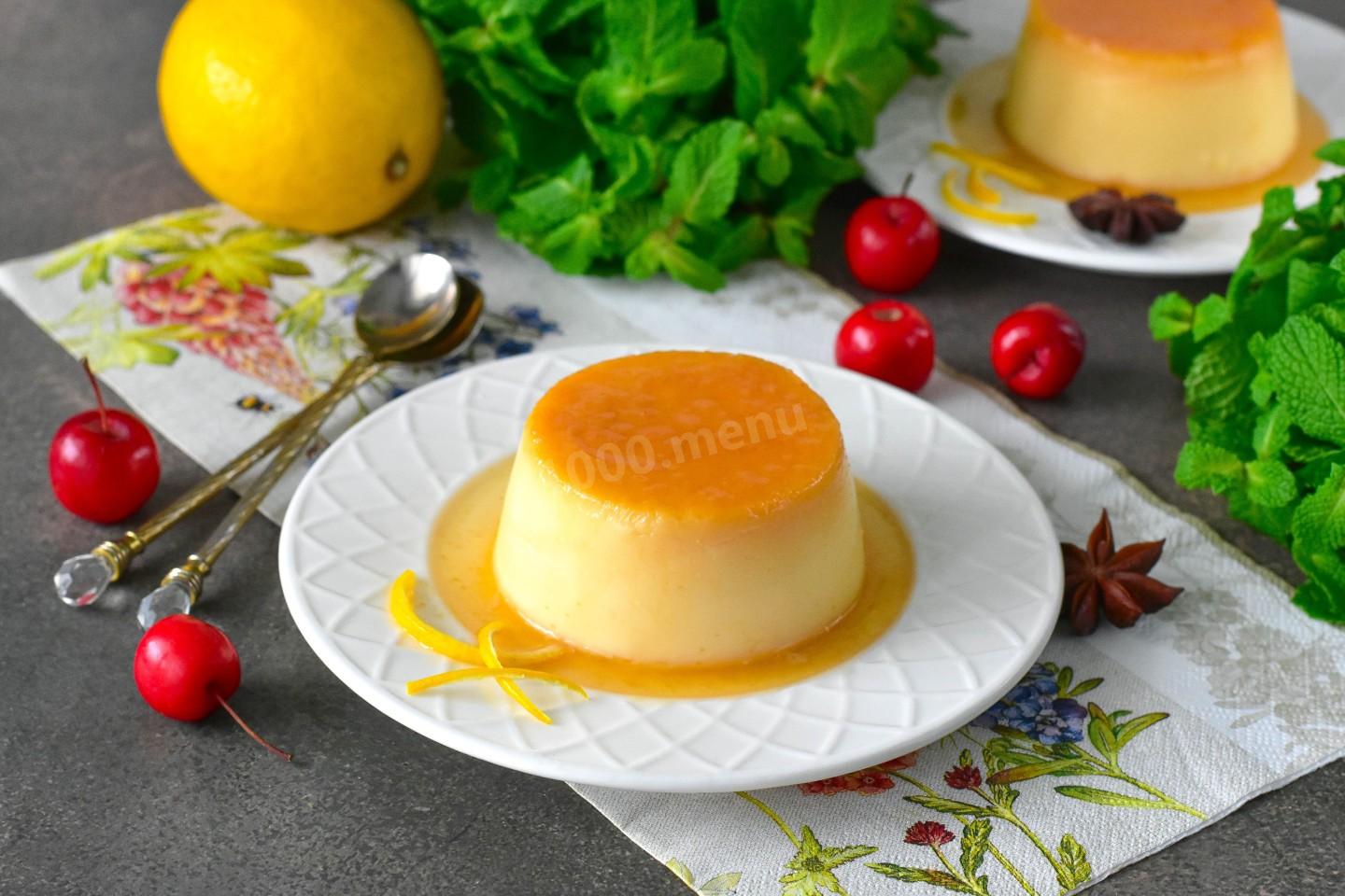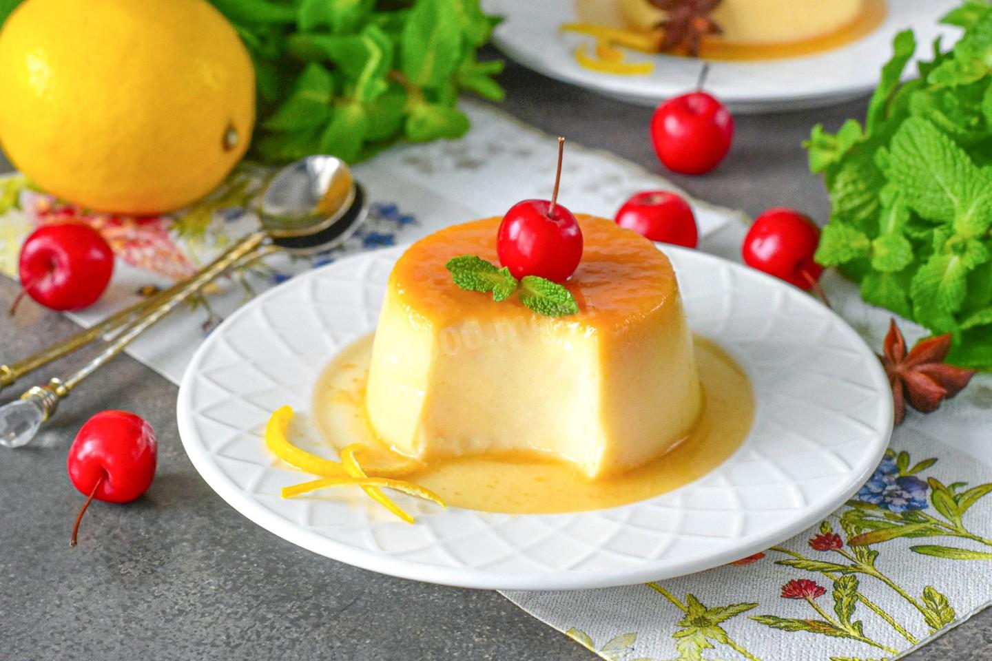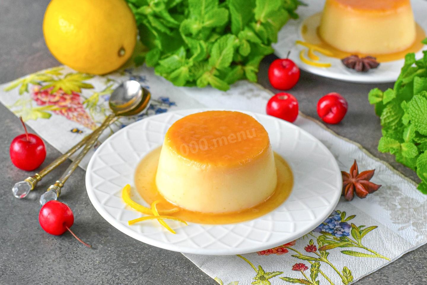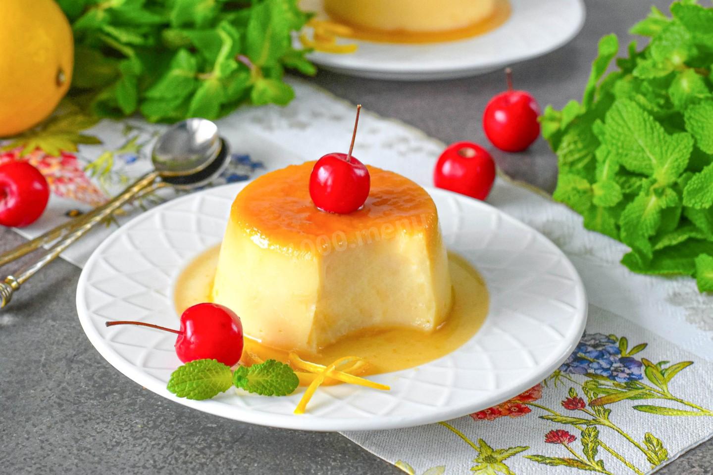Перед подачей формочки наполовину окуните на 30 секунд в горячую воду и переверните на тарелки. Карамельный пудинг украсьте мятой и лимонной цедрой и подайте к столу. Приятного аппетита!