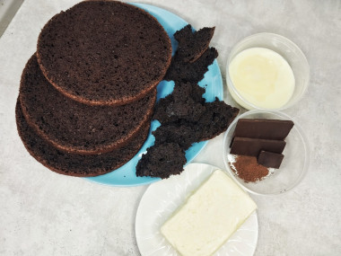 Приступаем к сборке торта. Полностью остывший бисквит разрезаем на 3 коржа. Если у вас верхушка у бисквита получилась не ровной, а с бугорком, то сперва подровняйте верх бисквита.