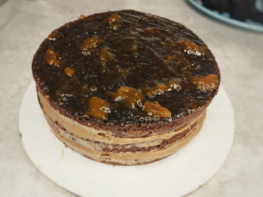 Джем, если он очень густой, слегка прогреваем в микроволновке и смазываем им верхушку торта. В таком виде отправляем торт в холодильник на 1 час, за это время джем должен схватиться.