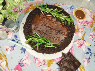 Я торт дополнительно еще украсила, но делать это совсем не обязательно. Для дополнительного украшения я взбила 100 г жирных сливок с 1 ст. л. сахарной пудры, а в конце добавила еще остатки шоколадной глазури. Получился очень вкусный шоколадный крем. С помощью кондитерского мешка с насадкой звезда, сделала бортик вокруг торта, а сверху просто выдавила небольшие завитки. Надпись сделала растопленным белым шоколадом.