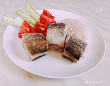 Минтай оказался очень вкусным и сочным, с тонким сливочным ароматом. Образовавшийся сок использовали в качестве подливки для риса.